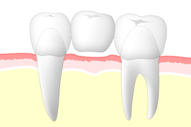ブリッジとは、失ってしまった歯の両隣の歯を削って土台をつくり、橋渡しのように人工歯を入れる治療法です。